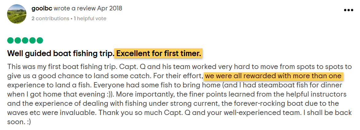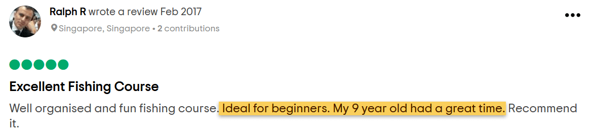 The beginner anglers course was informative and the instructors were patient and experienced. Would definitely recommend to anyone who like to pick up some fishing knowledge and tips from the experts.