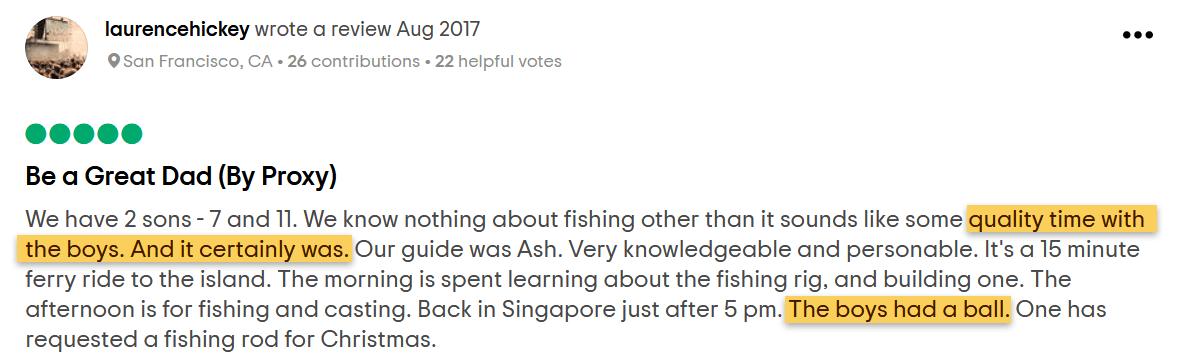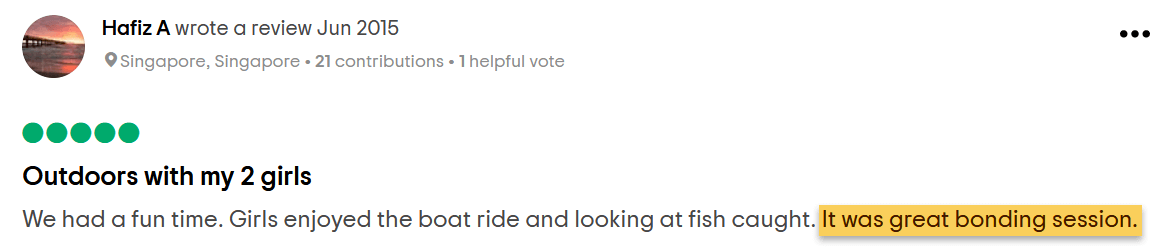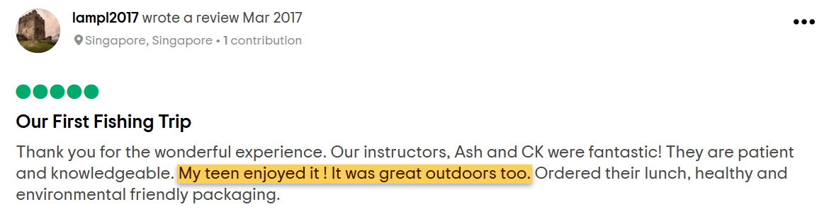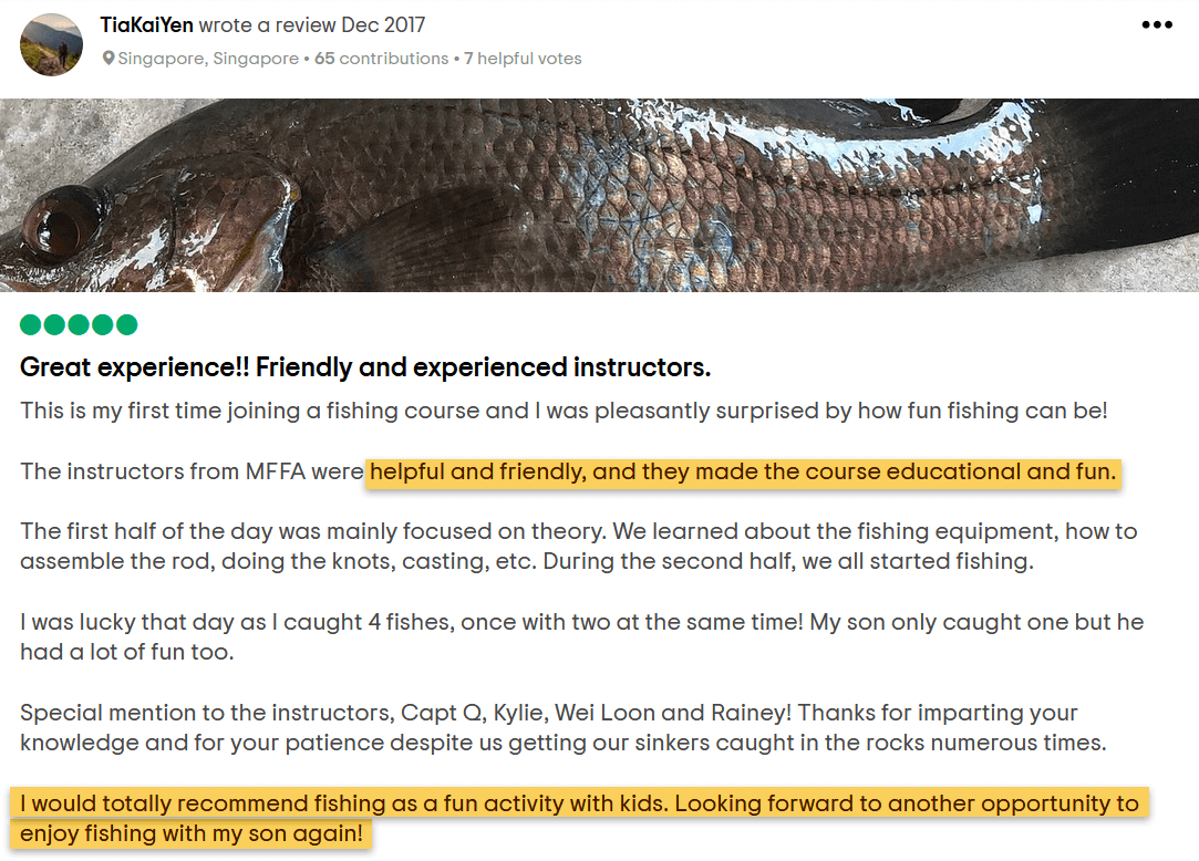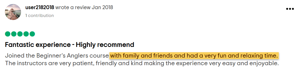 "The instructors were helpful and friendly, and they made the course educational and fun... totally recommend fishing as a fun activity with kids. Looking forward to fish with my son again!"
