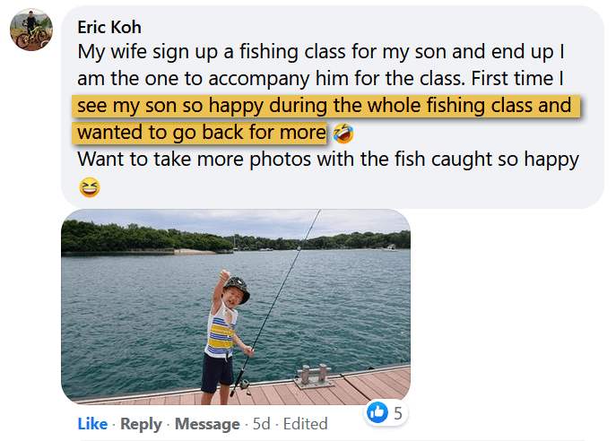 "First time I see my son so happy during the whole fishing class and wanted to go back for more!"